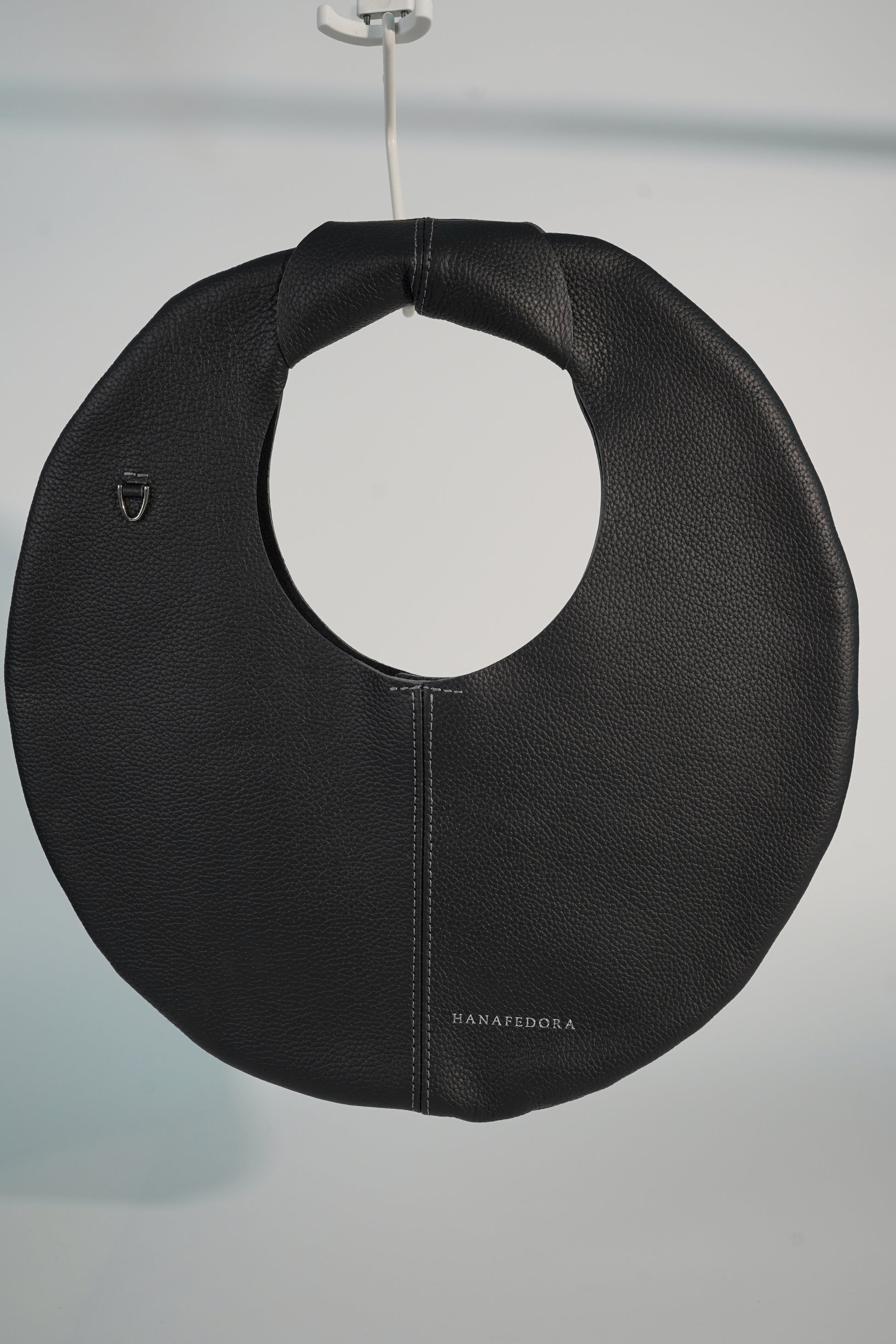 Feature: Circle with D-ring on side. Snap magnet closure.
