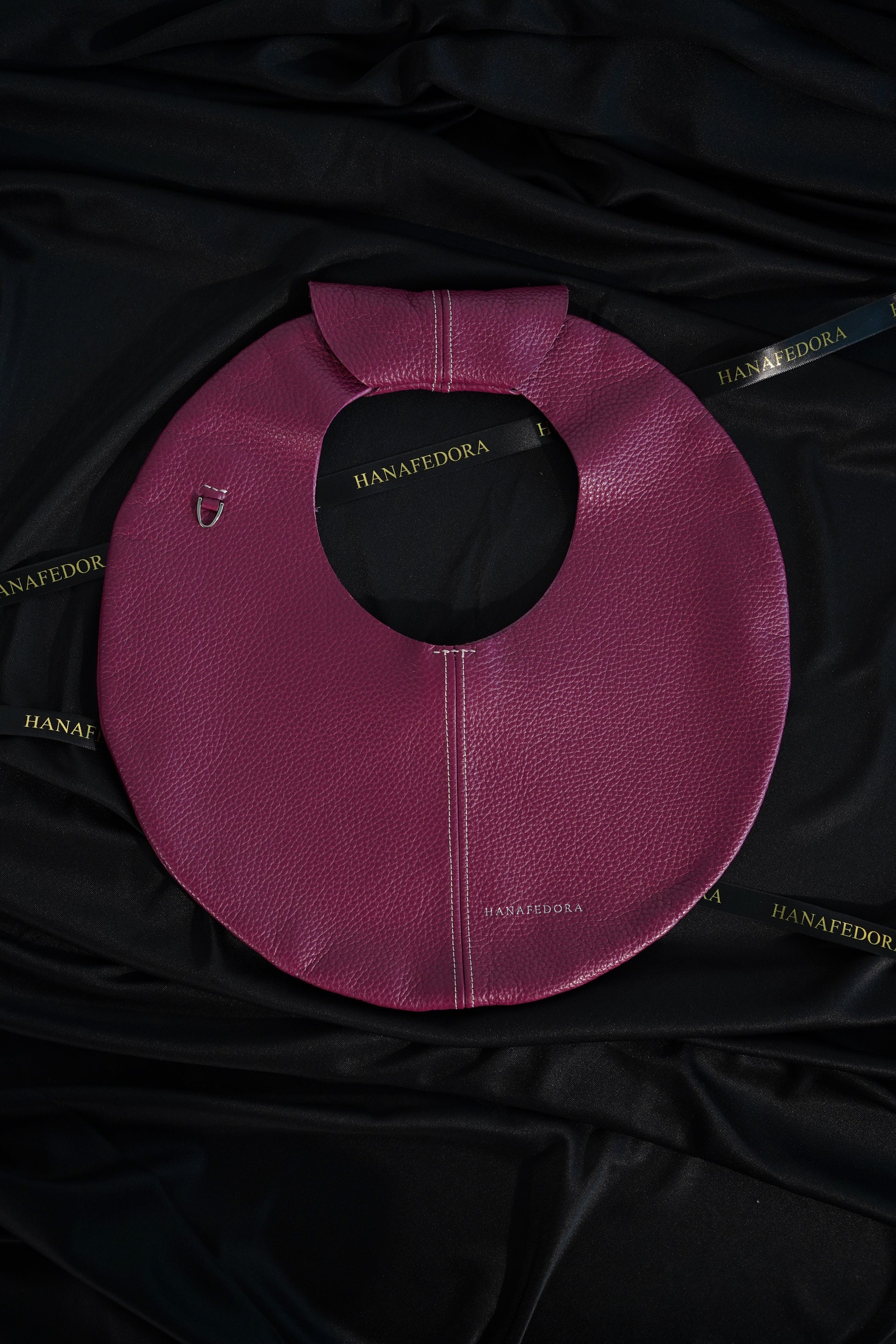 Feature: Circle with D-ring on side. Snap magnet closure.